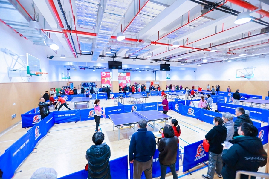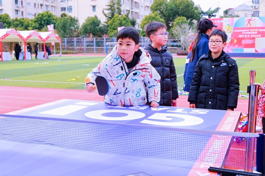 2月7日上午,甘泉外国语中学体育馆里响起一连串清脆的击球声。球台这边,穿着运动服的“隔壁爷叔”把球轻轻一搓;球台那头,附近商户的老板刚把卷帘门拉下就赶来参赛。看台上,孩子们举着手机给家里人直播;场外的亲子嘉年华区,一个小朋友把乒乓球“滚”进保龄球瓶,兴奋得蹦起来。